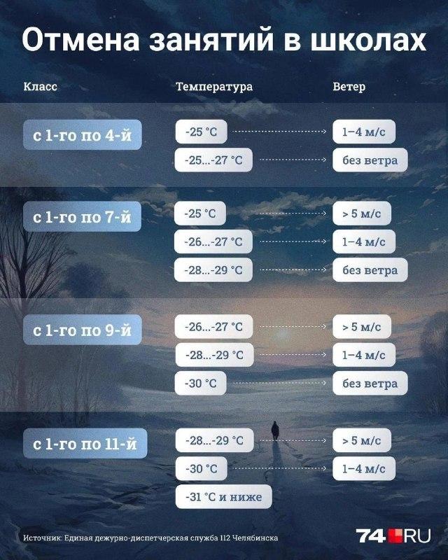 25 декабря, в четверг, в Челябинске отменили школьные занятия из-за сильных морозов. По информации городской дежурно-диспетчерской службы, дома остаются ученики 1-4 классов, независимо от смены обучения.