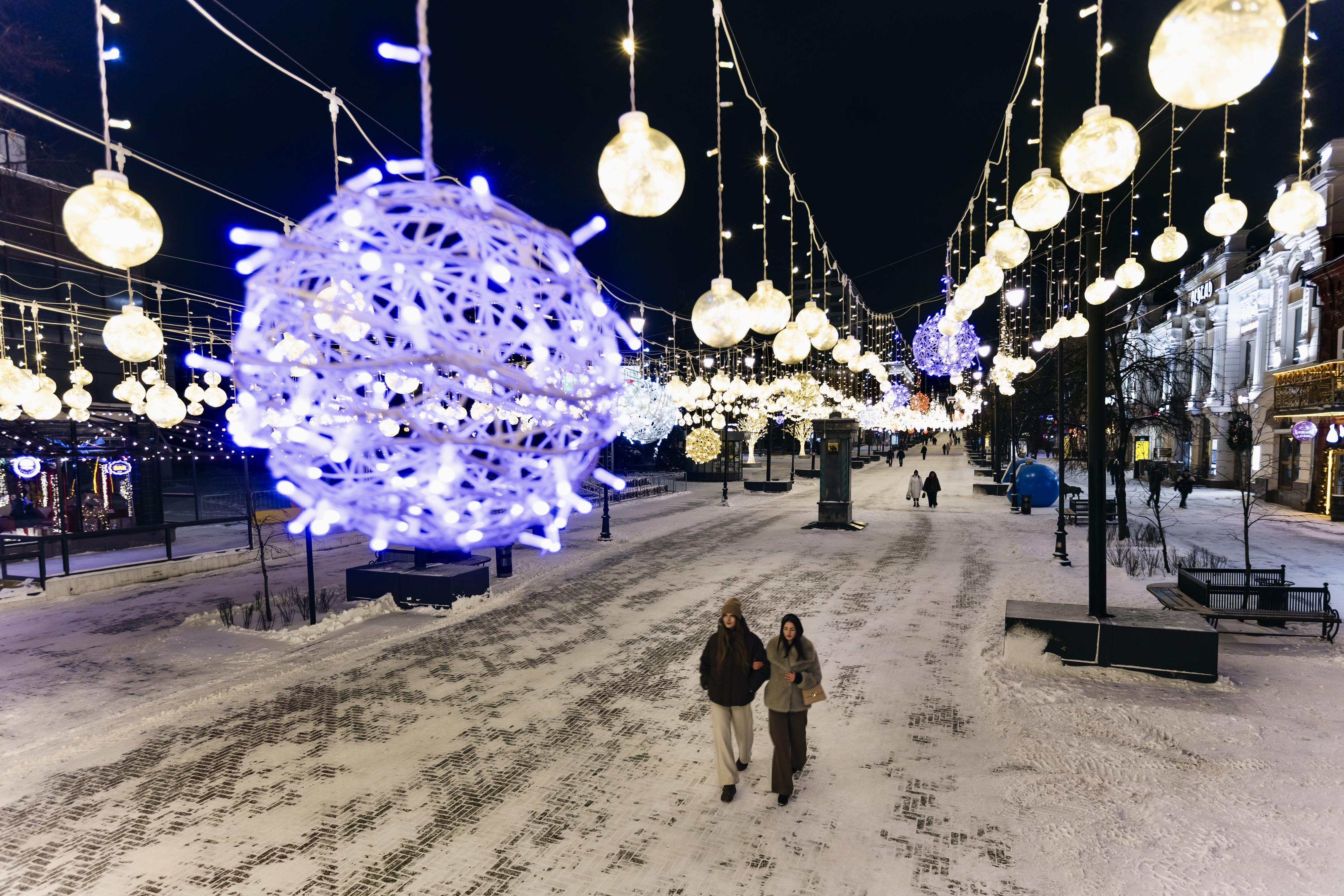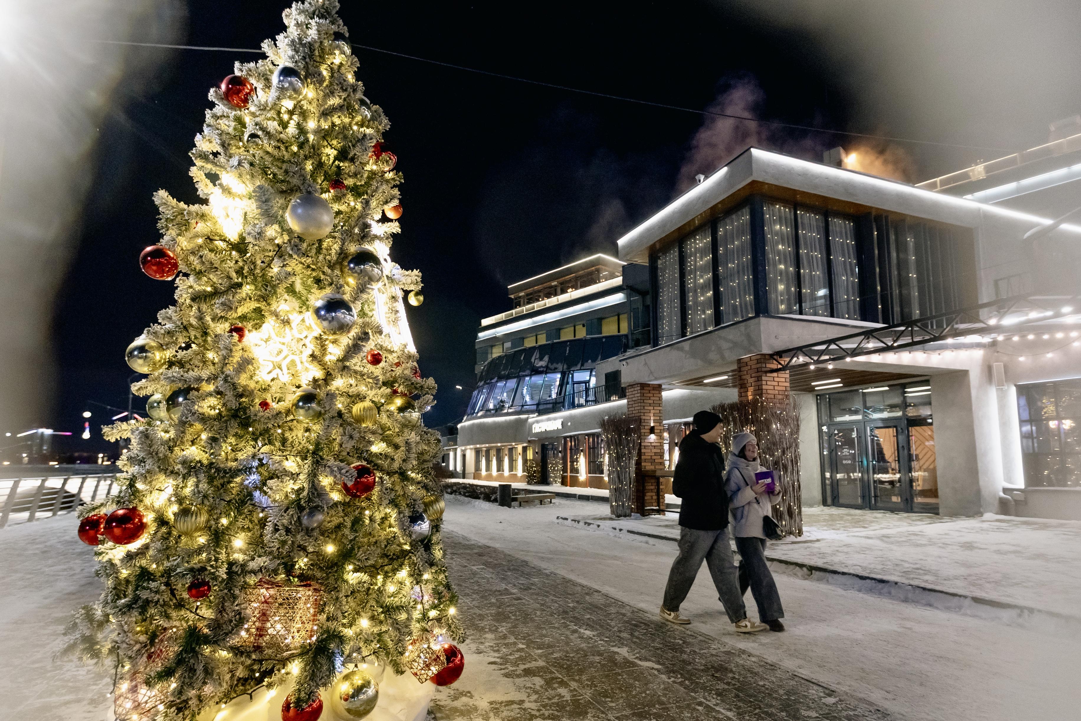 Чистые улицы, яркое освещение и сияющая ёлка создают ощущение праздника.