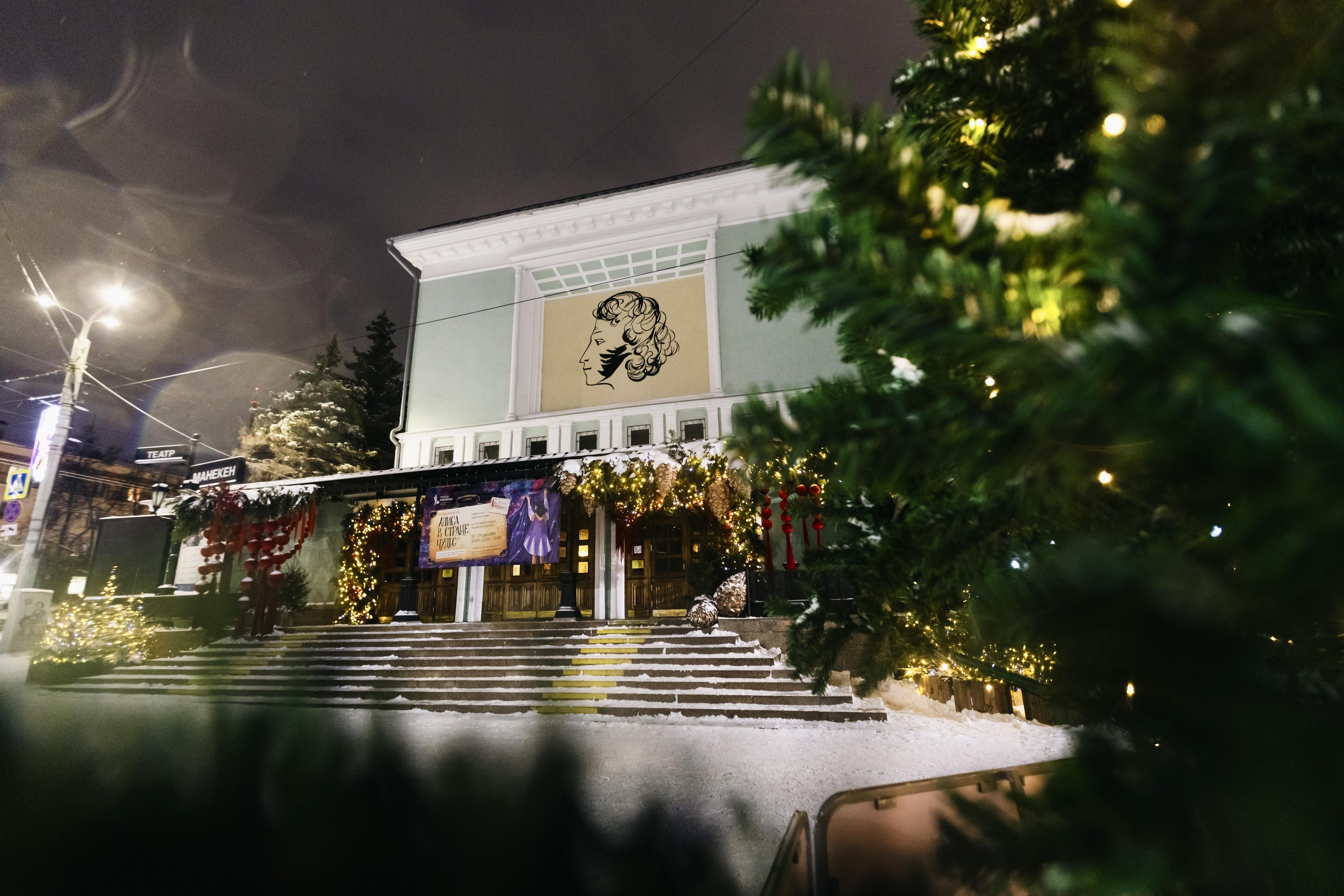 Фасад кинотеатра имени Пушкина напоминает яркий рождественский венок.