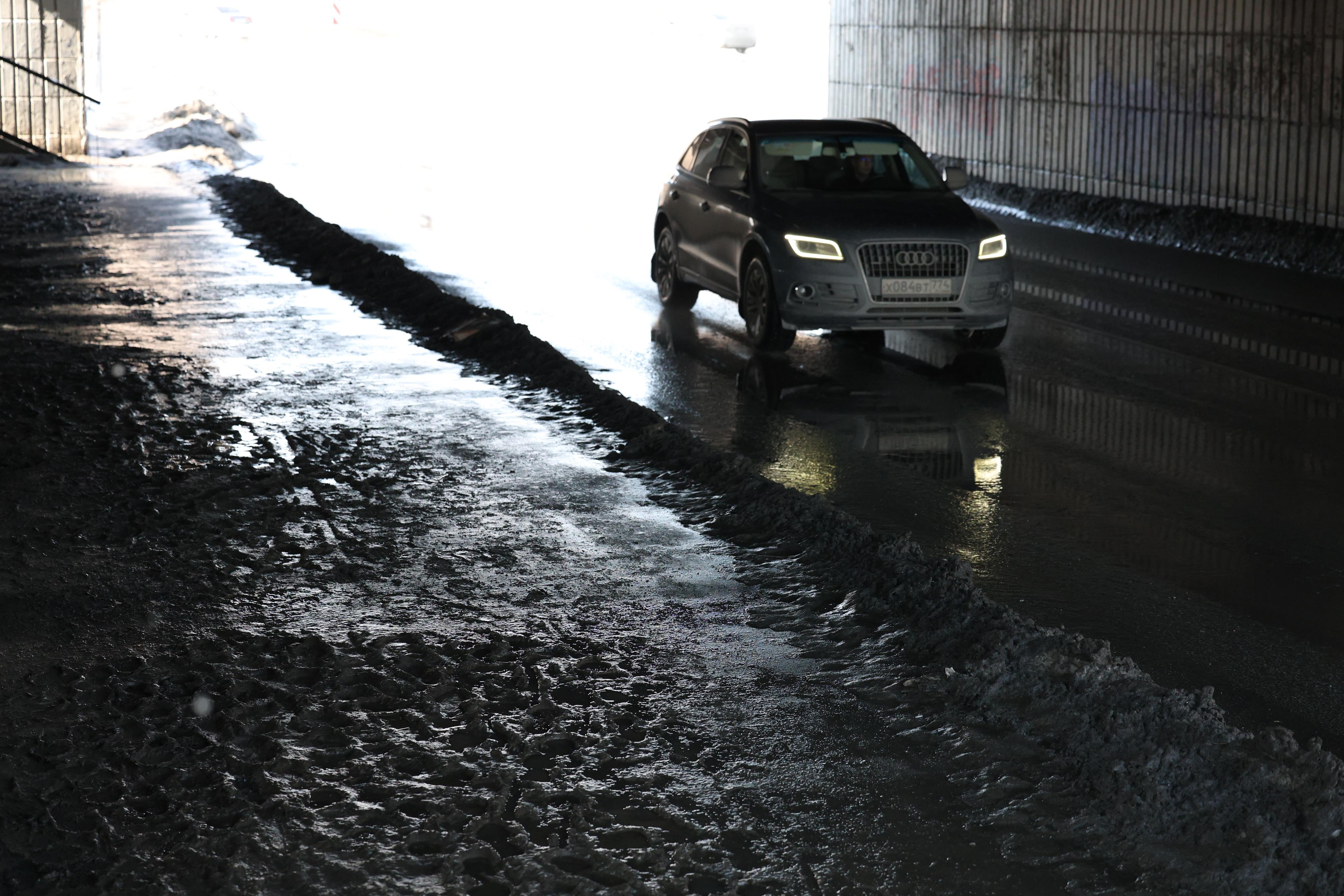 На Северо-Западе города, в Тракторозаводском районе, ситуация не лучше. Пешеходная зона вдоль парка «Сад Победы» на улице Салютной постоянно залита водой из-за снега, сбрасываемого сюда очистительной техникой, и стоков с территории парка.