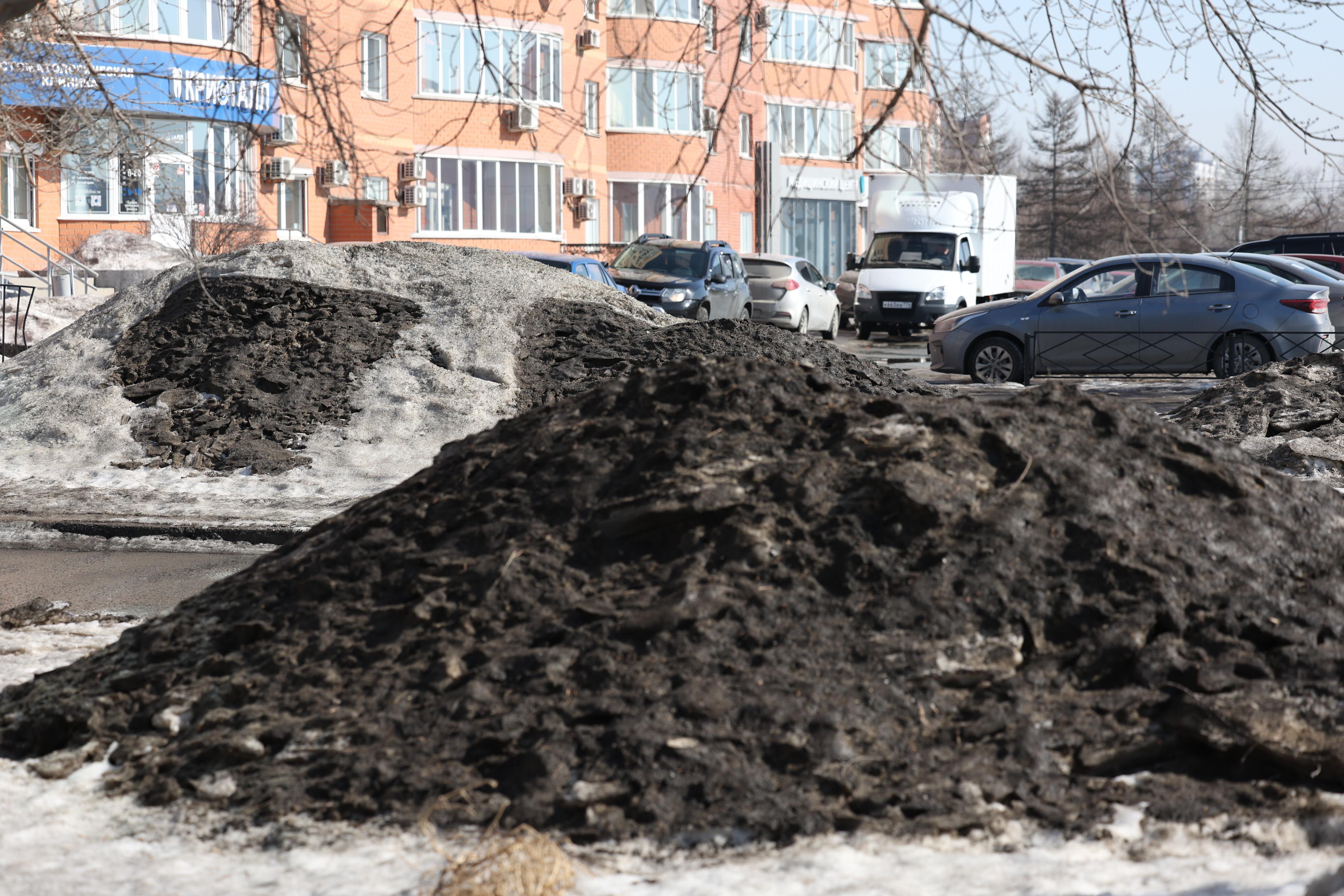 Снежные кучи в жилых районах напоминают промышленные отвалы
