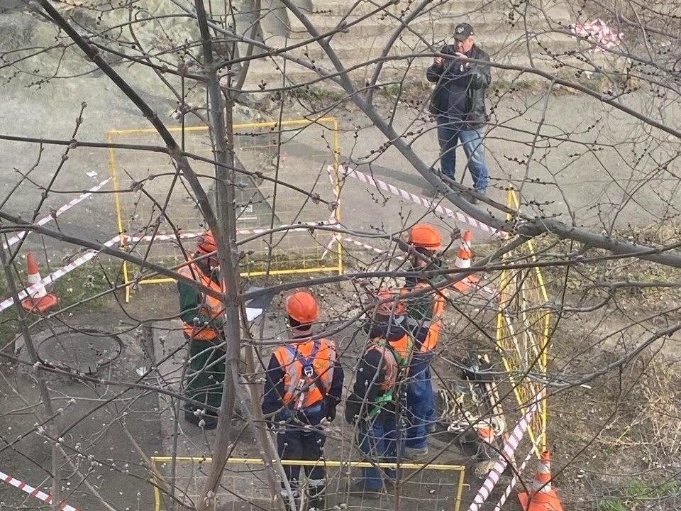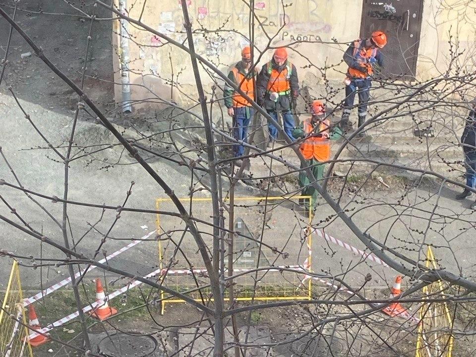Прибывшая бригада рабочих в новой форме расставила ограждения, но вместо осмотра или ремонта труб устроила фотосессию.