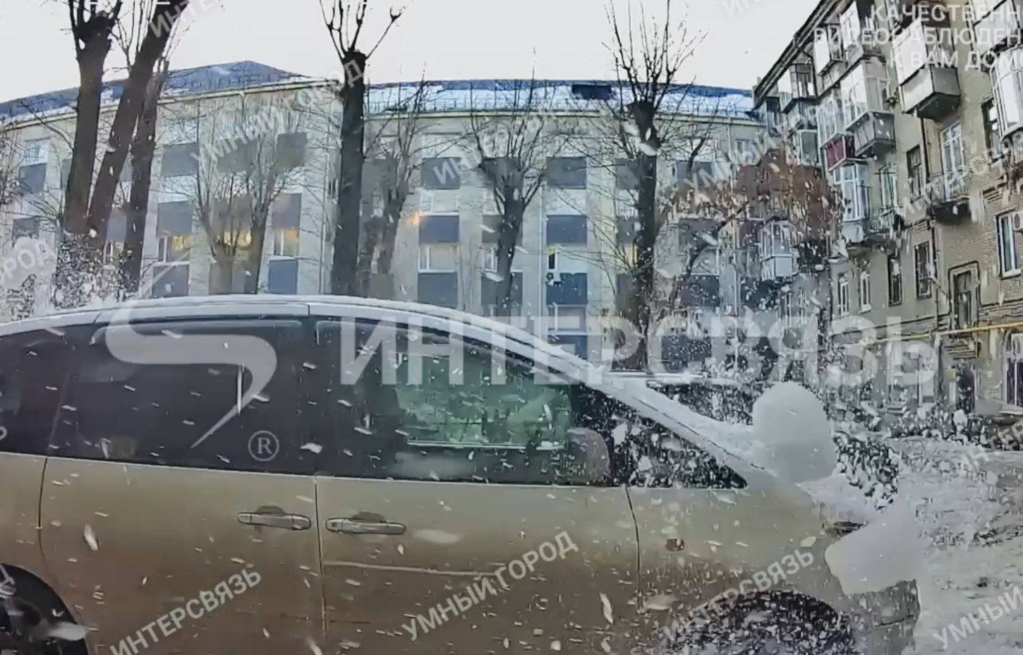 Машина, припаркованная у подъезда, повреждена упавшим с крыши льдом