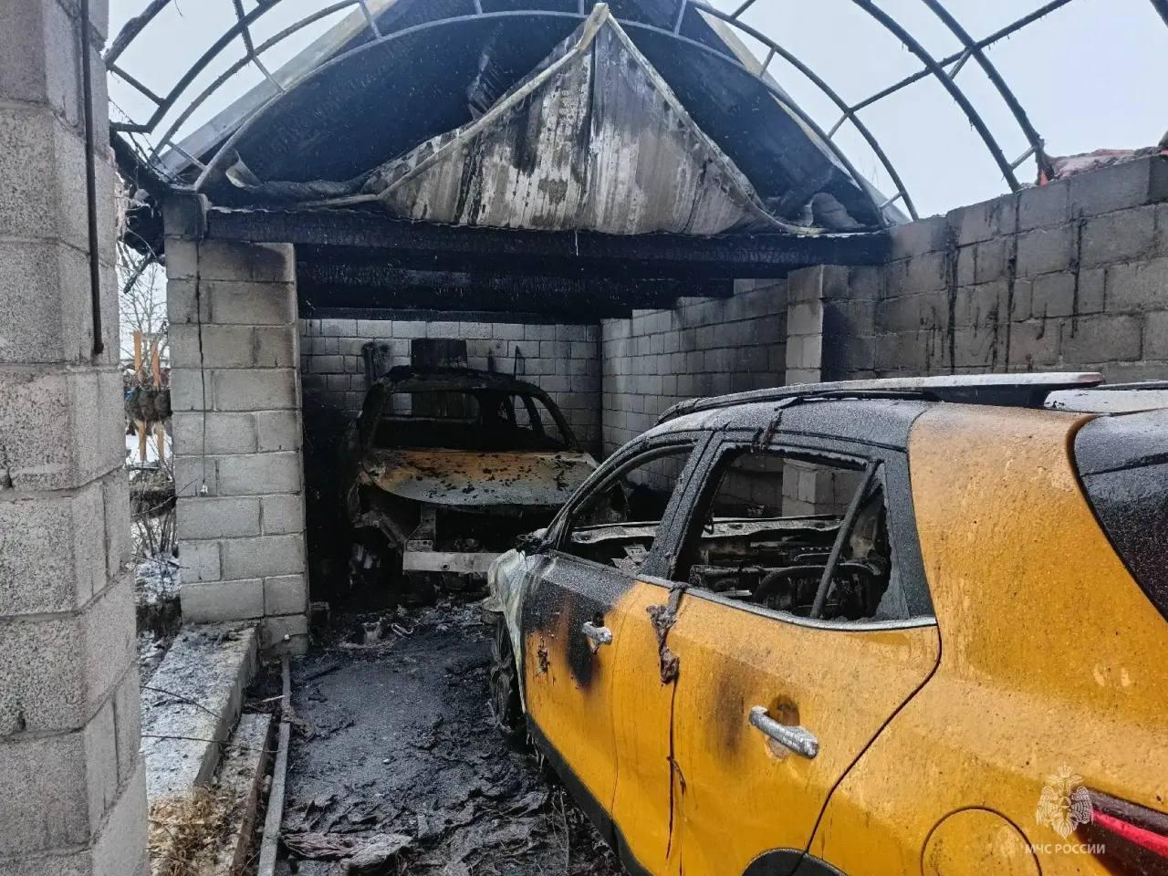 Ущерб от пожара: сгоревший гараж и автомобили внутри него.