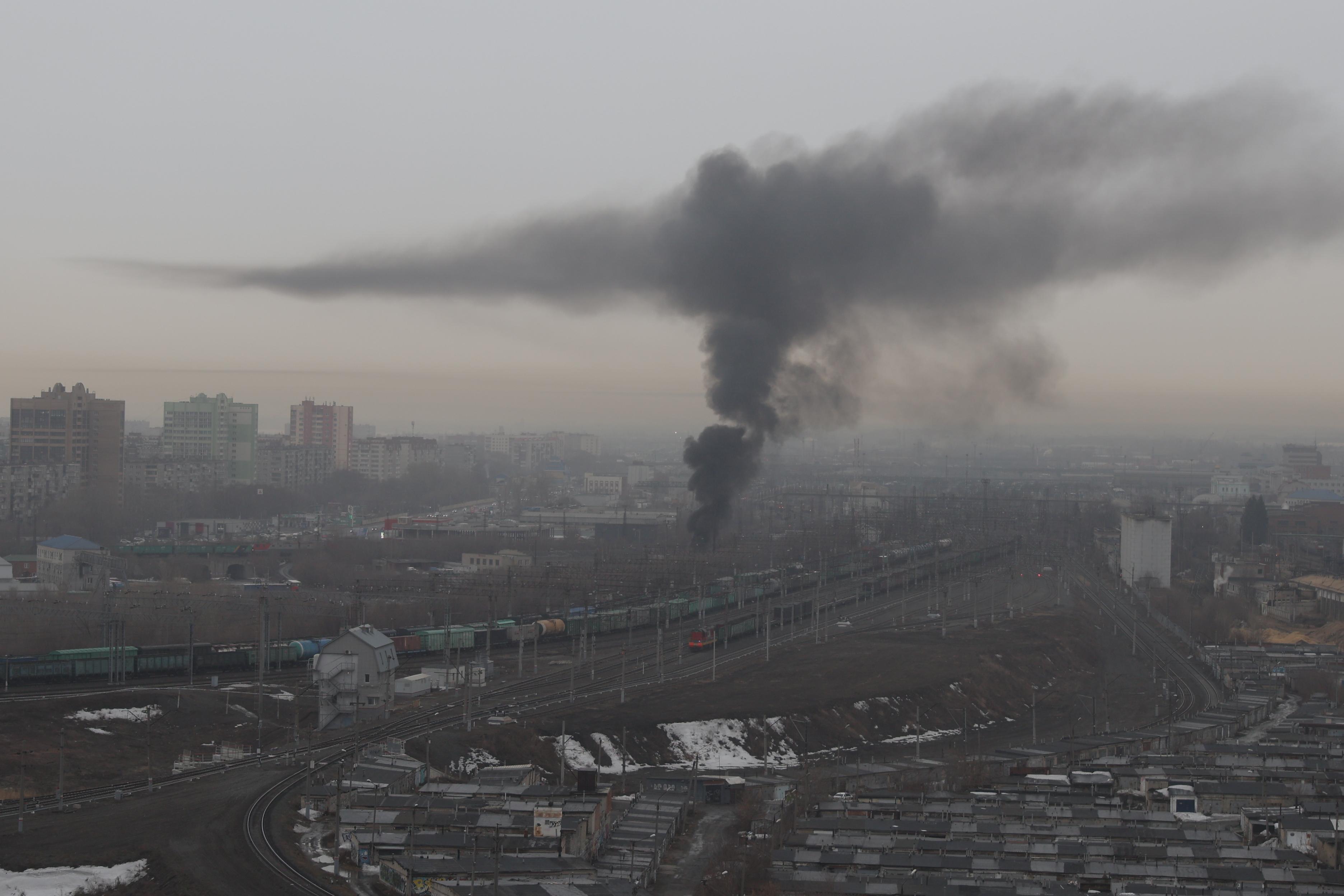 В среду, 25 марта, в дневное время в Челябинске в районе железнодорожного вокзала наблюдался мощный черный столб дыма, который был заметен из разных точек города.