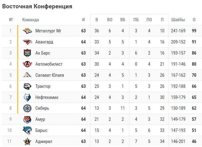 По текущему положению в турнирной таблице «Трактор» занимает шестое место в Восточной конференции. На счету команды 66 очков.