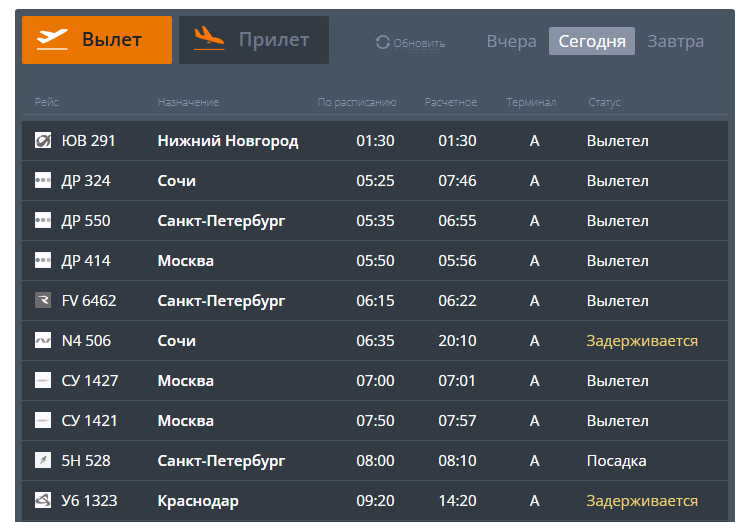 Согласно данным онлайн-табло, рейс N4 506 в Сочи, запланированный на 06:35, перенесен на 20:10. Рейс У6 1323 в Краснодар, который должен был вылететь в 09:20, теперь ожидается в 14:20.