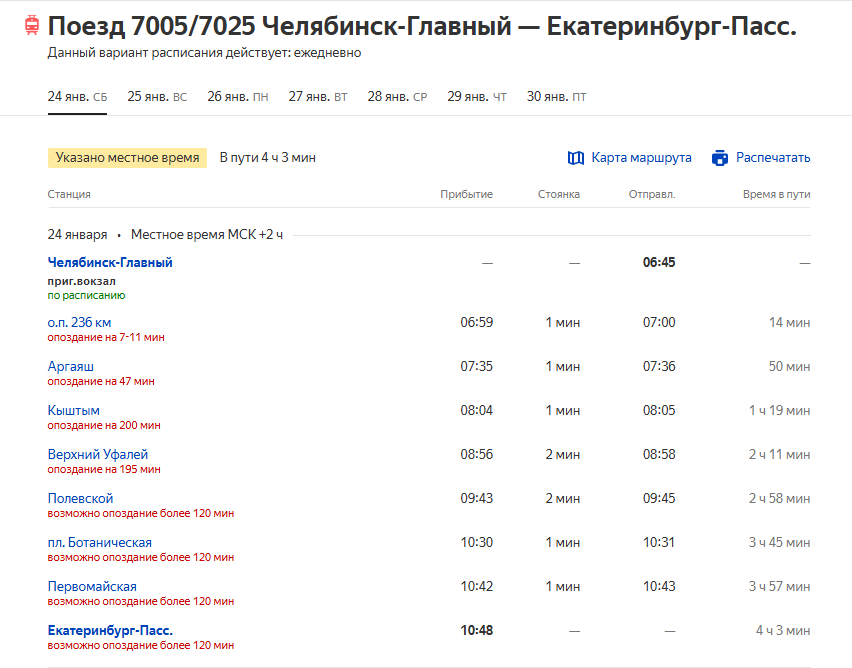 «24 января на перегоне Бижеляк-Кыштым Южно-Уральской железной дороги в связи с технической неисправностью пригородного поезда № 7005/7025, следующего из Челябинска в Верхний Уфалей, произошла его вынужденная остановка. В настоящее время пассажиры осуществляют посадку во вспомогательный подвижной состав».