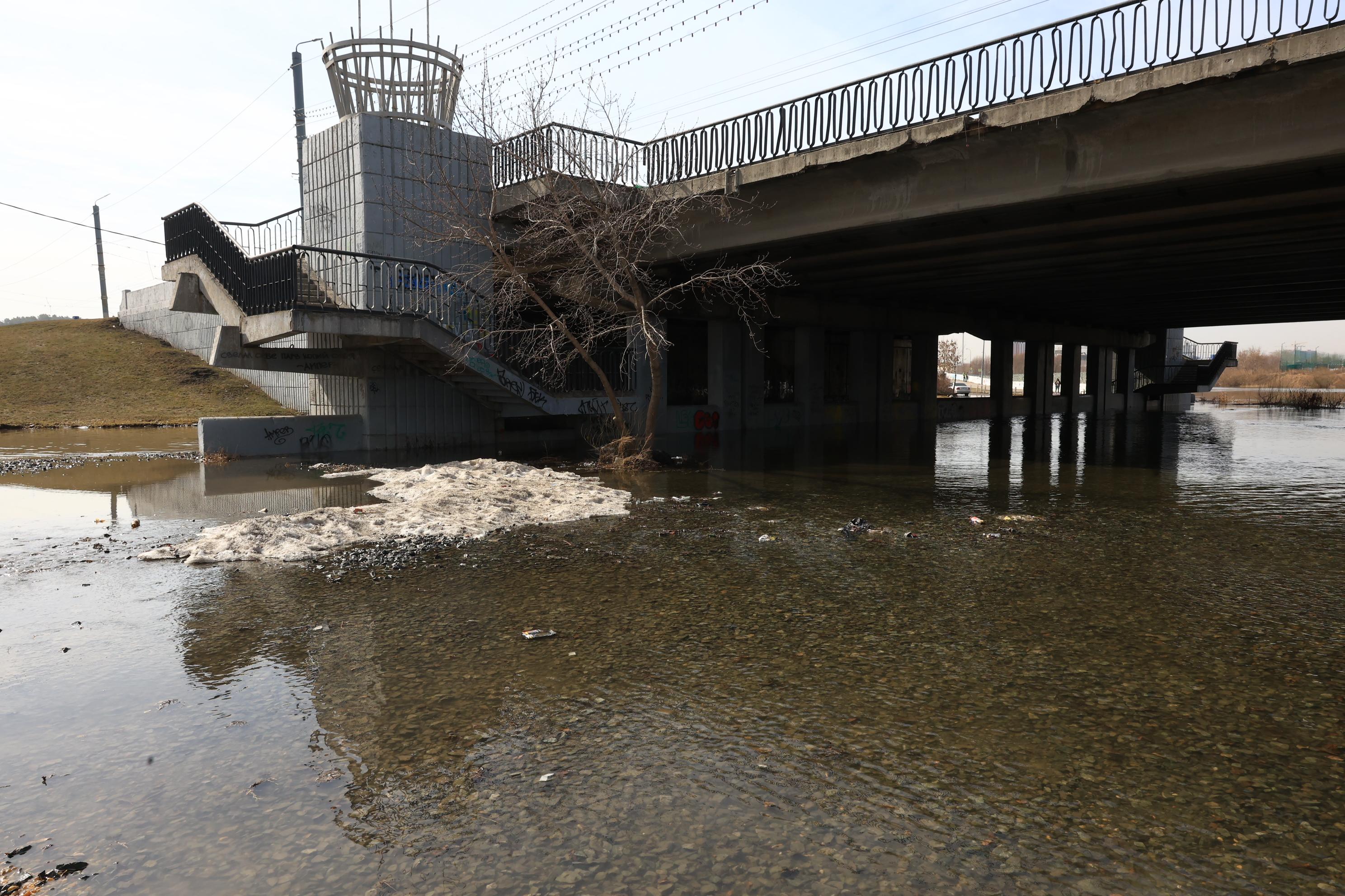 Проезды под мостом оказались затоплены из-за разлива реки.