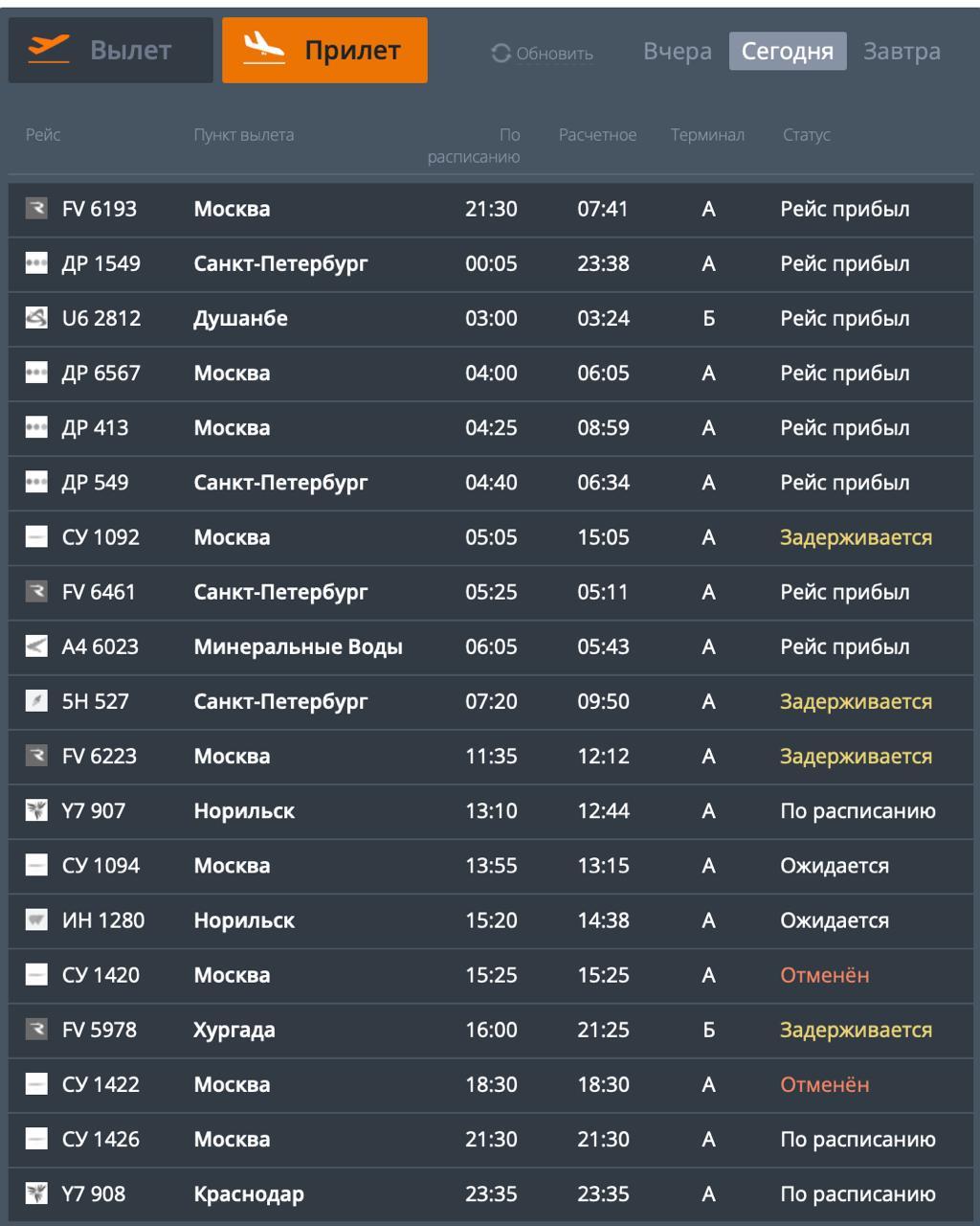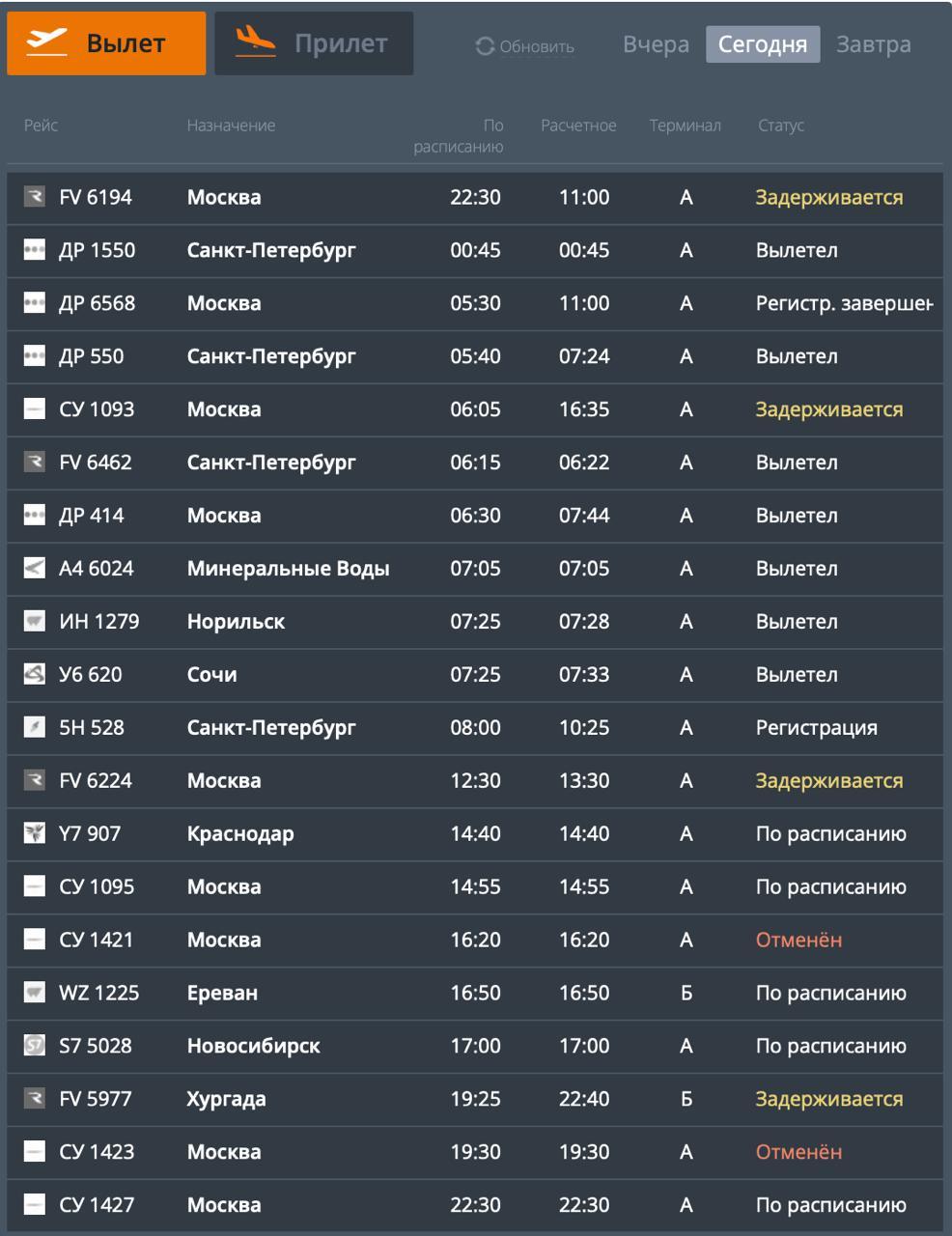 Пассажиры авиакомпании «Россия» ожидают вылета в Москву с вечера предыдущего дня: их рейс с 22:30 задержан до 11:00. Утренний рейс «Победы» с 5:30 также отложен до 11:00, а рейс «Аэрофлота» с 6:05 перенесен на 16:35. Дневные рейсы продолжают задерживаться, при этом два рейса «Аэрофлота» на 16:20 и 19:30 уже отменены.
