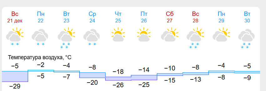 Резкое похолодание в Челябинске сменилось потеплением. К вечеру воскресенья, 21 декабря, столбик термометра показывает -5 градусов. Аналогичная погода, по прогнозам, ожидается в понедельник и вторник. Однако уже со среды в регион придёт новая волна холода, сообщают различные метеорологические сервисы.