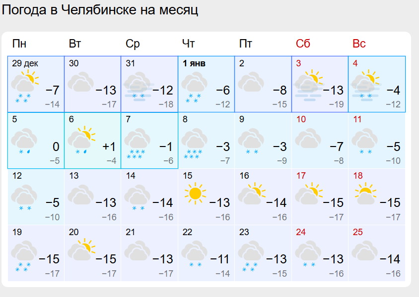 Гидрометцентр России 29 декабря сообщил, что средняя температура января на Южном Урале ожидается в диапазоне -12…-16°C, что на один градус превышает норму.
